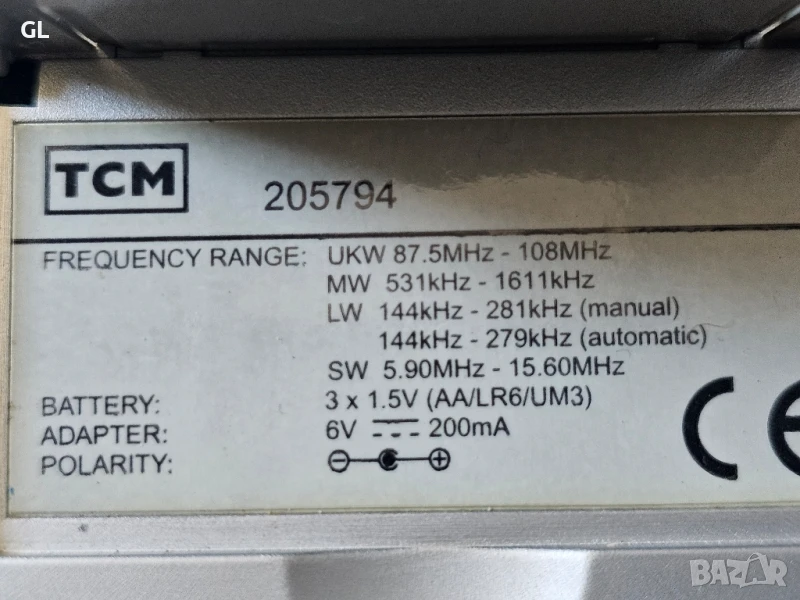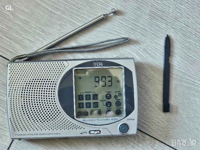 Радиоприемник, дълги вълни, къси вълни плюс FM или UHF. Вид захранване и напрежение Сухи батерии / AA: 3 x 1,5 волта и адаптор. Високоговорител Динамичен високоговорител с изходна мощност 0,1 W Модел: TCM FM/MW/LW/SW PLL Двоен будилник радио 205793 - TCM Tchibo "Marke" / "brand", Форма Много малък Преносим или джобен комплект (ръчен) < 8 инча. Размери (WHD) 150 x 90 x 40 мм / 5,9 x 3,5 x 1,6 инча Бележки FM/MW/LW/SW-PLL Радио с двоен будилник с контролен панел със сензорен екран