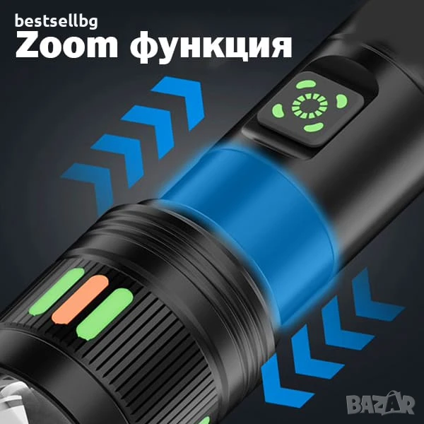 Регулируемият фокус (ZOOM) е още една ключова функция. С помощта на телескопичен механизъм можете лесно да превключвате между широк ъгъл на осветяване (Floodlight) за близка дистанция и фокусиран лъч (Spotlight) за осветяване на далечни обекти.