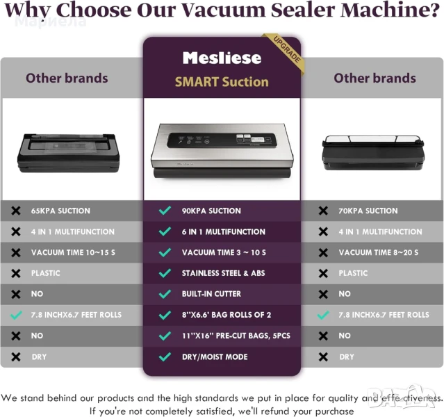 - 【Запазете храната свежа и спестете пари】Вакуумната машина Mesliese е проектирана да осигурява мощно засмукване с максимум 90kPa, което прави вакуумирането на всякакви храни много по-лесно и бързо. По-полезен начин за спестяване на пари и време.