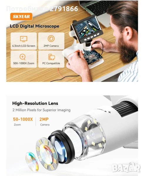- 🔎50X-1000X Увеличение - Изследвайте микроскопичния свят с широк диапазон на увеличение. Действителното увеличение варира в зависимост от фактори като размер на екрана, разстояние на камерата до обекта и условия на наблюдение.