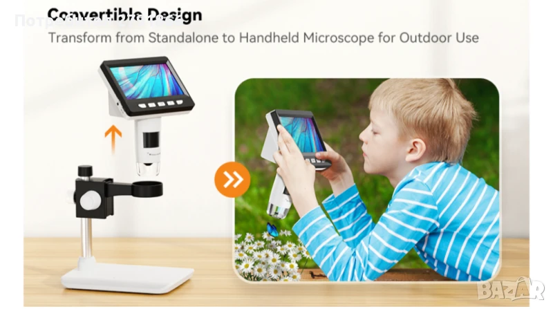 - 🔎Трансформируем и преносим - Безпроблемно преминаване от настолен микроскоп към преносим ръчен микроскоп с екран за секунди.