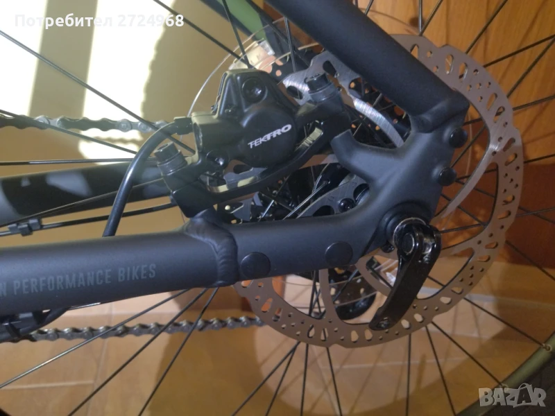 Вилката с ход от 100 мм осигурява ефикасно поглъщане на удара за по-голям комфорт при неравен терен. Хидравличната спирачна система Tektro HD-M275 с 2 бутала и хидравлични дискове осигурява бързо и безопасно спиране, основен елемент за поддържане на контрол при променливи пътни условия.