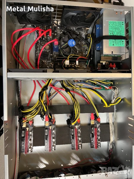 Налично в комплекта има дъно, рам харддск, екстендери, захранване и охлаждане, кабели и всичко което се вижда на снимките. Готова за работа. Може да се тества при желание на клиента. Досега е работела с 4х3090 ASUS Rog Strix. Перфектен, надежден и компактен риг. Bitcoin, etherium, solana, crypto mining, asic.