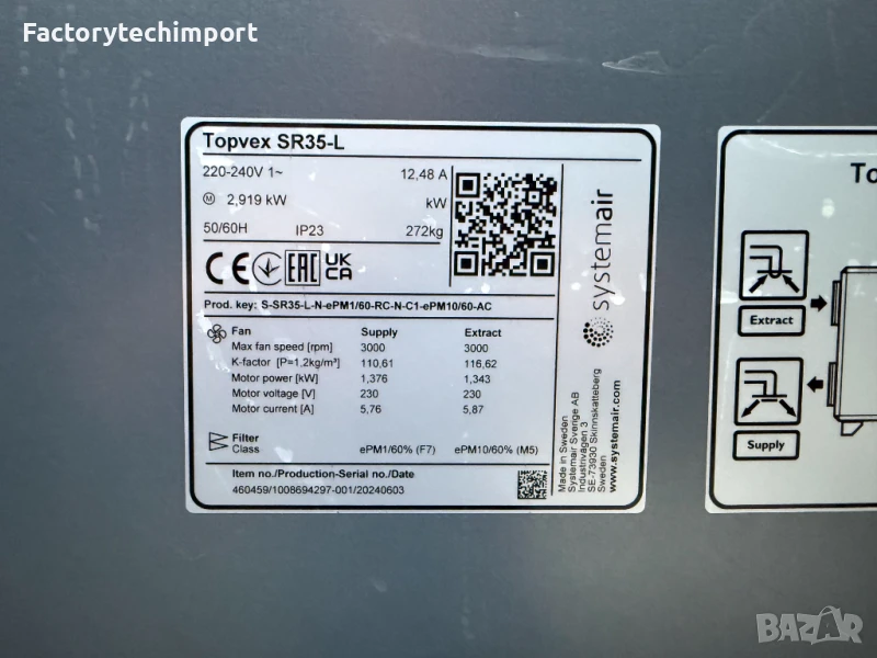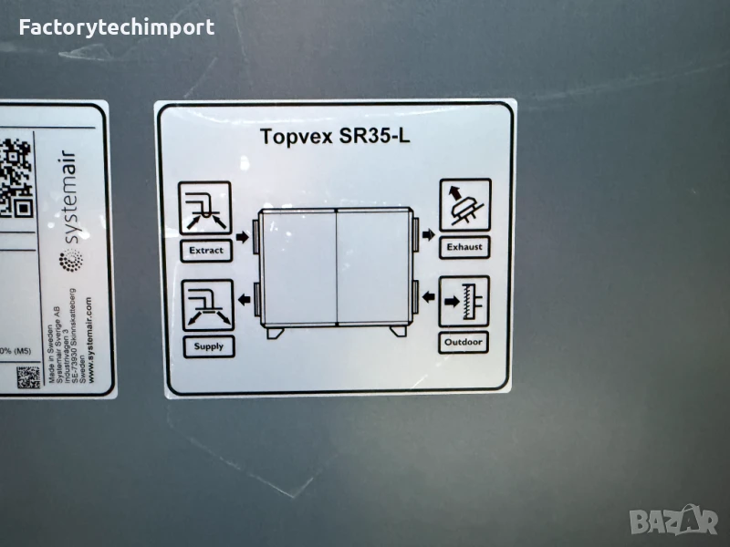 Systemair Topvex SR35-L е вентилаторна климатична система с рекуперация на топлина. Това означава, че тя вкарва чист въздух отвън в сградата и изкарва застоялия въздух отвътре, като същевременно спестява енергия, като използва топлината от отработения въздух.
