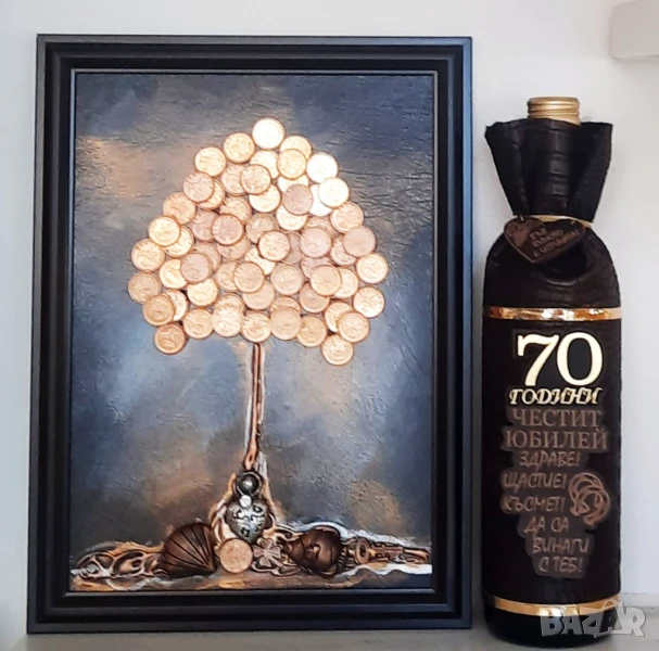 Авторска картина Дървото на живота с истински монети в комплект с бутилка декорирана с кожа във формата на торбичка и дървена плочка със златни цифри 50 години, и пожелание "Здраве, щастие, късмет и през следващите петдесет".