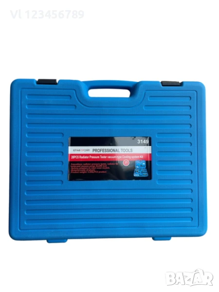 Комплекты включва още манометьр с работно налягане 0-35 psi, помпа с накрайник и бърза вризка, клапан за налягане, както и радиаторни адаптери за тестване на налягане и течове.