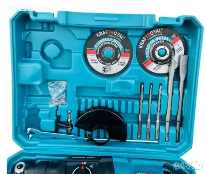 Пакетът включва и редица полезни аксесоари като гъвкави дискове за рязане на метал, спирали (свредла) за пробиване в зидария, длета (плоски и заострени), дистанционер, патронник и гаечни ключове. Включена е и кутия за съхранение, за да поддържате вашите инструменти организирани и защитени.