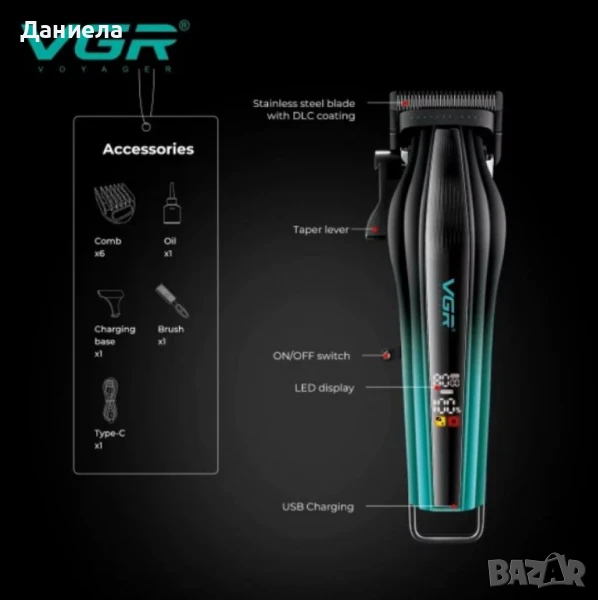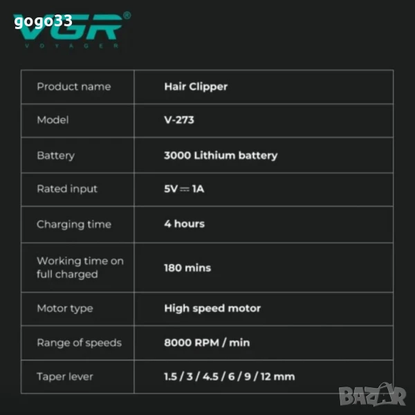 Тип остриета: DLC – Diamond-Like CarbonДължина на рязане (без гребен): 0.5 – 2.5 мм (с лост)Наставки: 6 бр. – 1.5 / 3 / 4.5 / 6 / 9 / 12 ммМотор: Ротационен, 8000 оборота в минутаБатерия: Литиево-йонна, 3000 mAhВреме на работа: до 180 минути с едно зарежданеВреме за зареждане: около 3 часаЗареждане: USB-C (универсално, подходящо за пътуване)Дисплей: LED с индикации за батерия, поддръжка, скорост и зарежданеРабота: Безжична