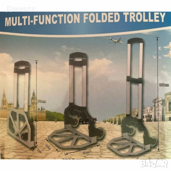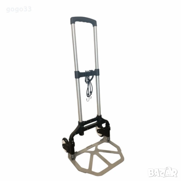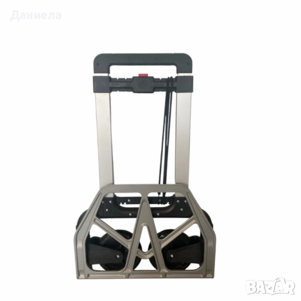 Размер (в сгънат вид): 70x5см или 76x6см;Размер (в разгънат вид): около 100см височина;Материал: метална рамка с пластмасови и гумени компоненти;Тип: сгъваема, с телескопична дръжка;Колела: двойни, устойчиви на износване;Подходяща за пренасяне на тежки торби, багаж, кашони и други.размер: