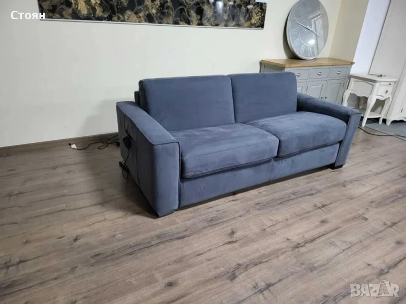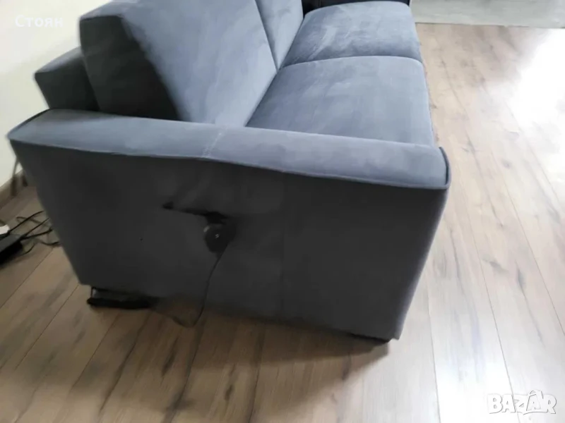 Сив диван тройка от плат набук с функция сън, като се отваря електрически с дистанционно.