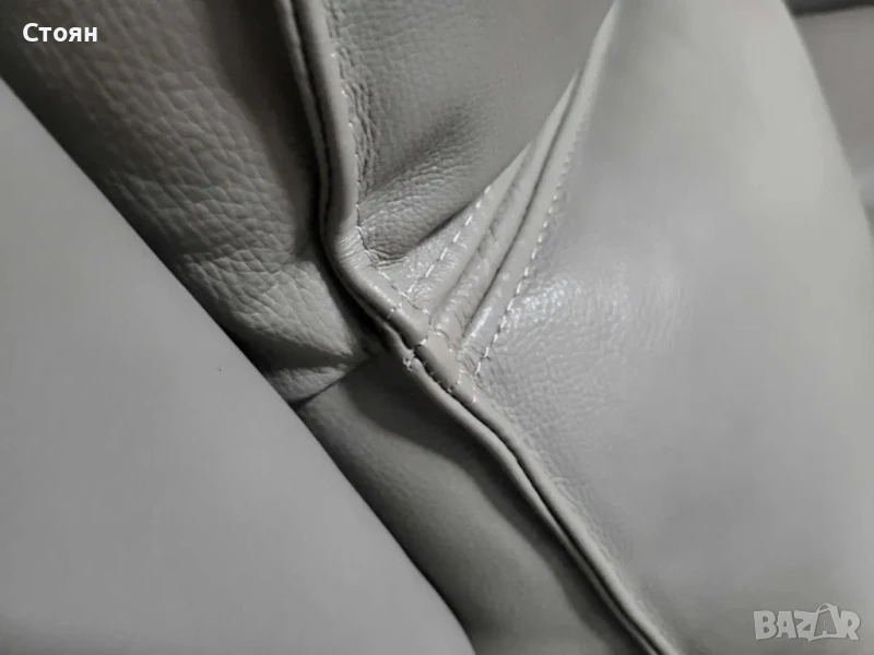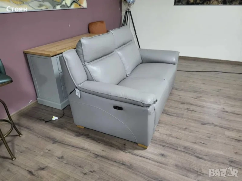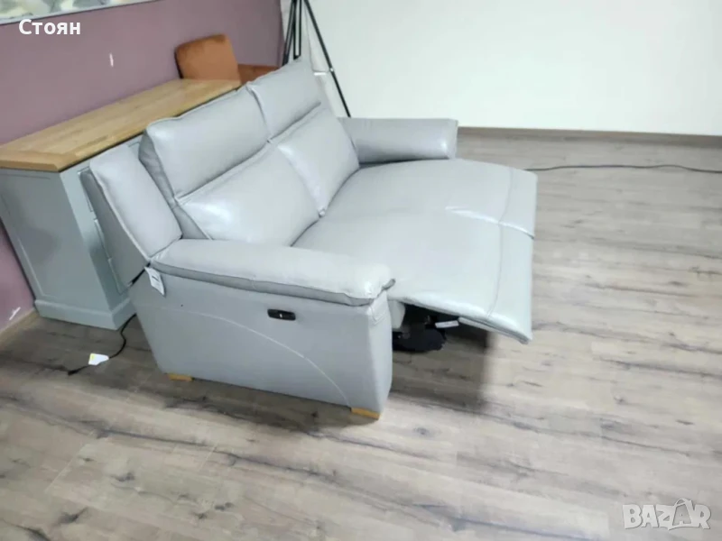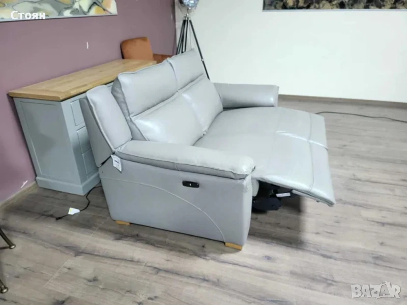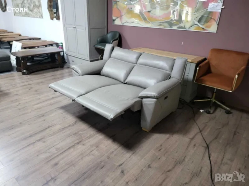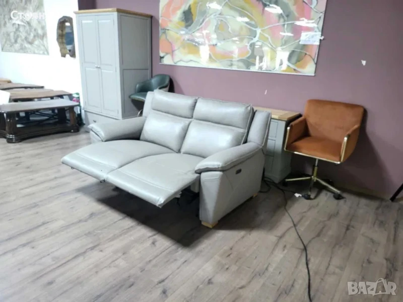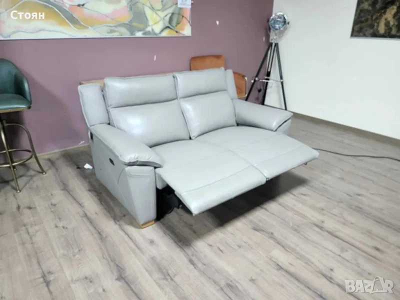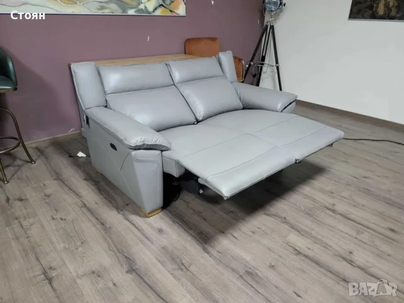 Сив кожен диван двойка с електрически релаксиращ механизъм за краката.