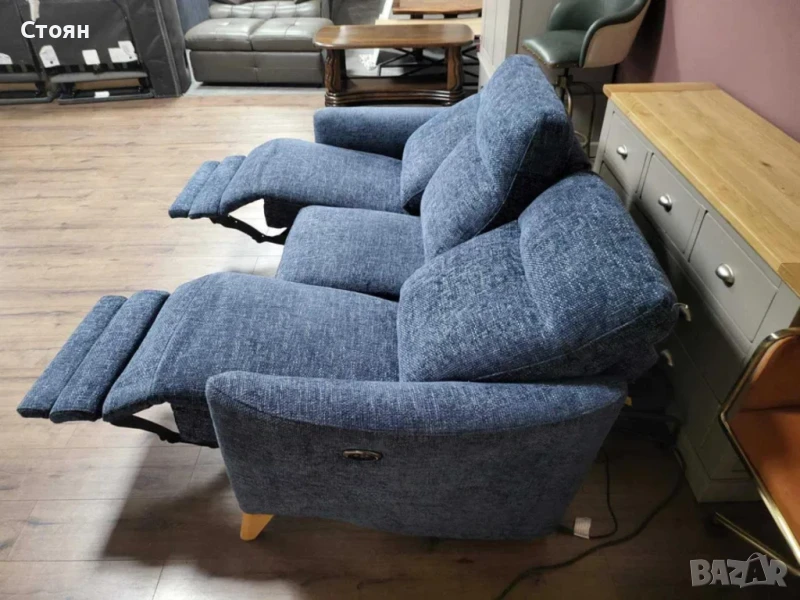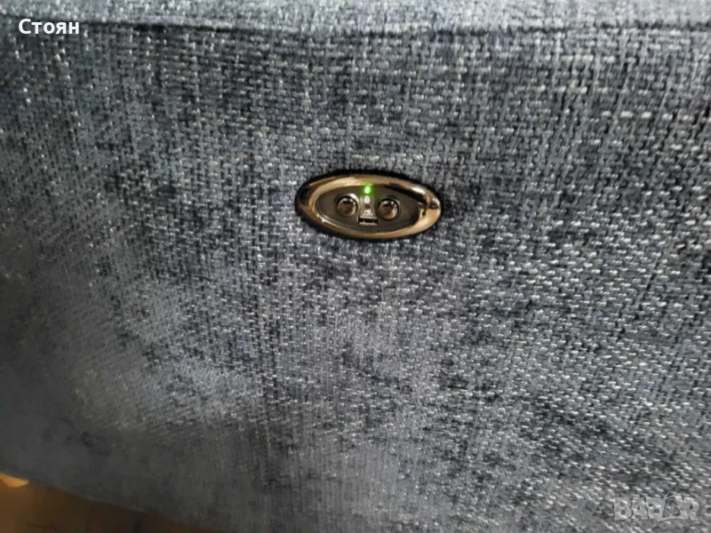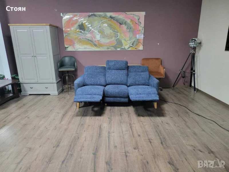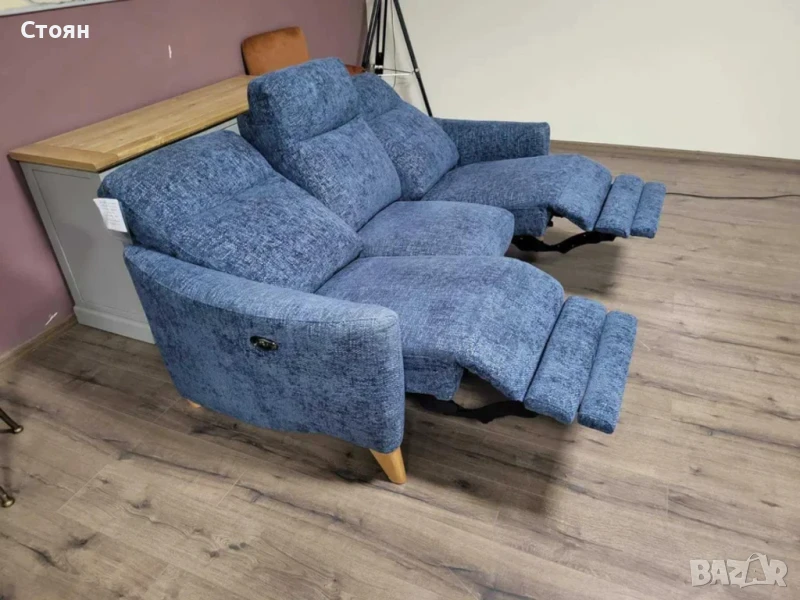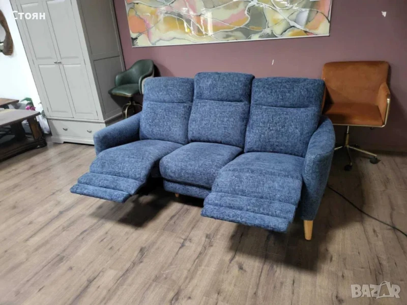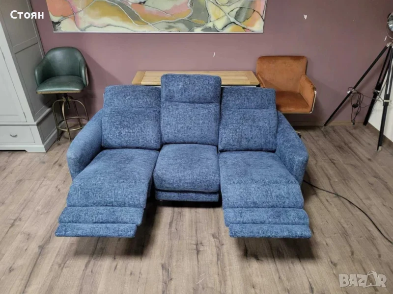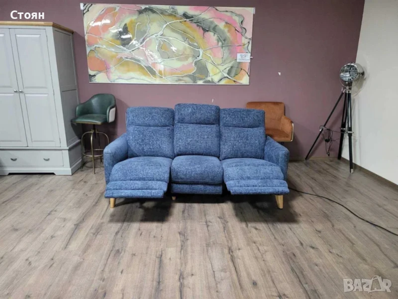 Сив диван от плат тройка с електрически релаксиращ механизъм за краката.