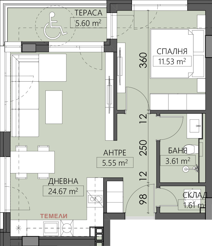 Разпределение: дневна с кухненски бокс, спалня, баня с тоалетна, тераса
