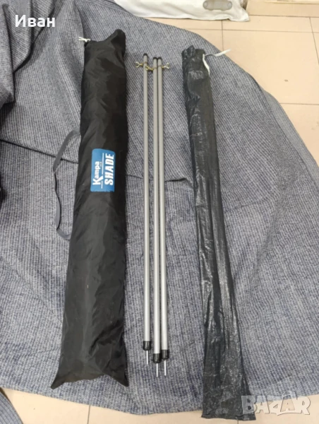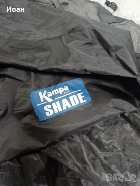 Тента, сенник Kampa Shade. Размери 310/220смТентата е като нова. Поставяна е само веднъж. Има два кедър шнура 4мм и 6мм. Това позволява да се монтира както на кедър лайсни на каравани, така и на тенти на кемпери ,Фиама, Омнистор и други. От всички страни е с мрежести панели които могат да се навиват нагоре или да се спуснат, предпазвайки от насекоми и като лека ветрозащита. В комплекта са включени три предни крака за изпъване на тентата. Kampa Shade е лека алтернатива на цялостната тента. Осигурява защита срещу слънцето, докато предните и страничните мрежести екрани действат като ветрозащити или като мрежи против насекоми, без напълно да пречат на видимостта. Подходящ за каравани или кемпери с височина на релсата на сенника 235-260см.