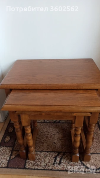 Продавам комплект от 3 помощни масички вложени една в другаи изработени от масивна дървесина. Класическа стабилна конструкция с фино обработени крака. Компактни, удобни ифункционални.