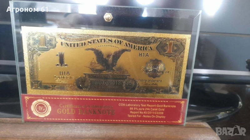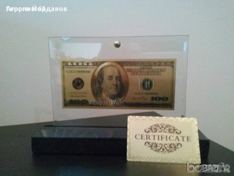 Златни банкноти изработени от златно фолио с чистота 24к и горещо пресована със специален поликарбонат за здравина и устойчивост поставена в стъклена поставка идеални за подарък или сувенир