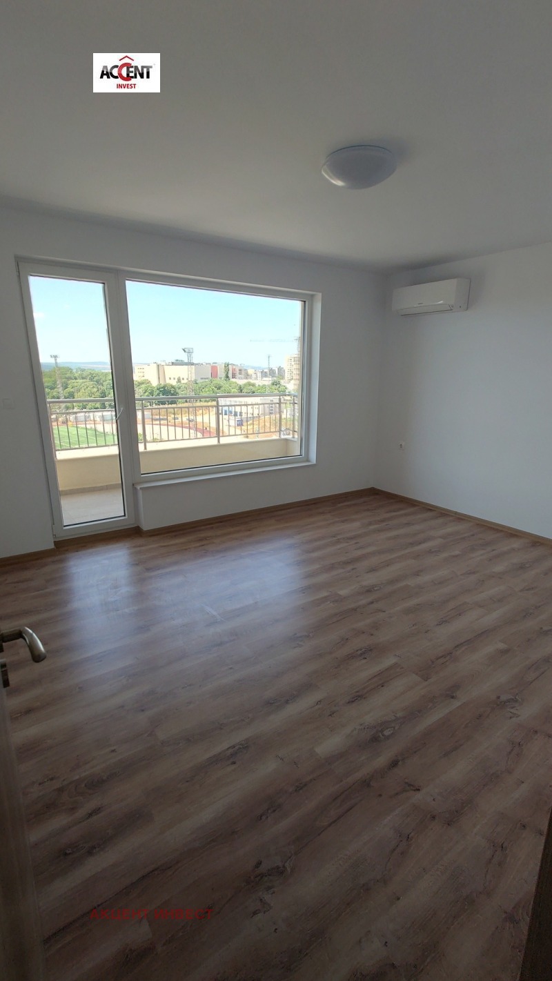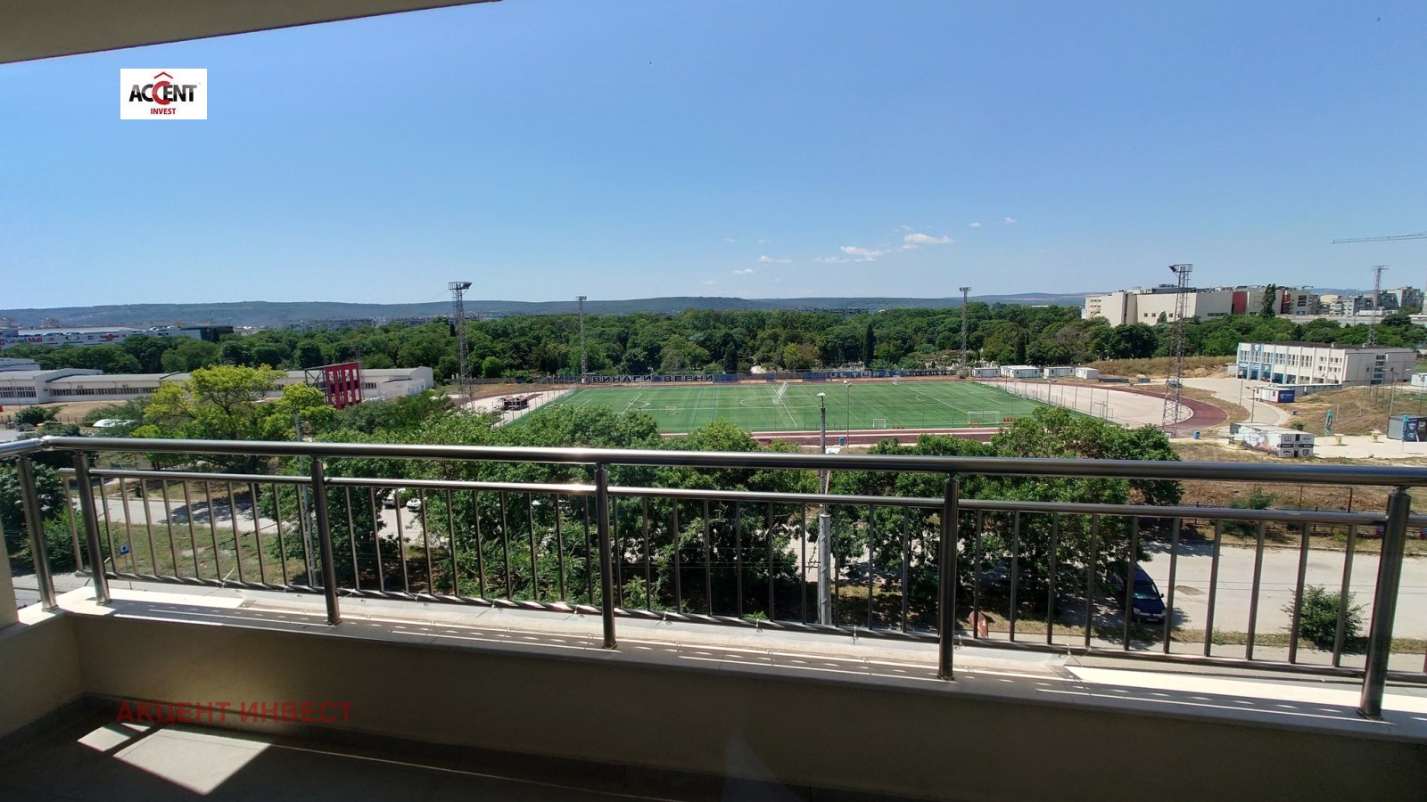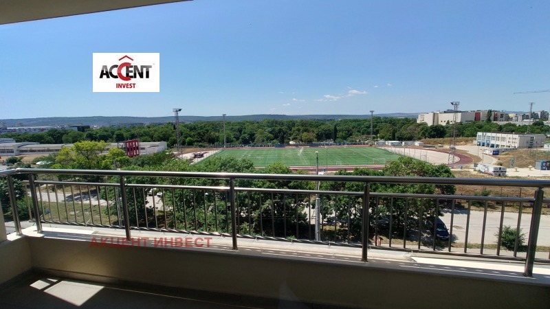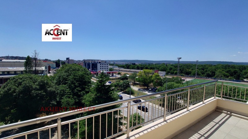 KOD 21469 'Акцент Инвест' Ви предлага офис помещение под наем след 'Гранд Мол'. Имотът е с обща площ от 123 кв.м. и се намира на 6-ти етаж в нова сграда. Състои се от коридор, три работни помещения, баня с тоалетна, тоалетна, килер, тераса пред двете стаи. Имотът се предлага без обзавеждане, посочената цена е без включен ДДС. Обектът е оборудван с бойлер, два климатика, СОТ система, щори. Допълнително се заплаща такса поддръжка, допълнително може да се наеме паркомясто.