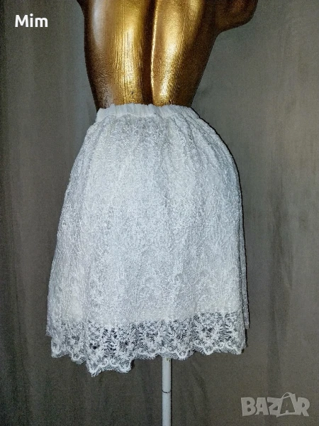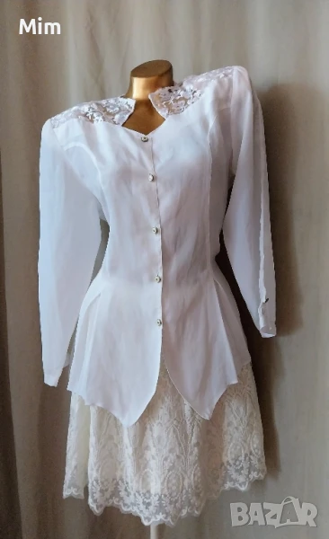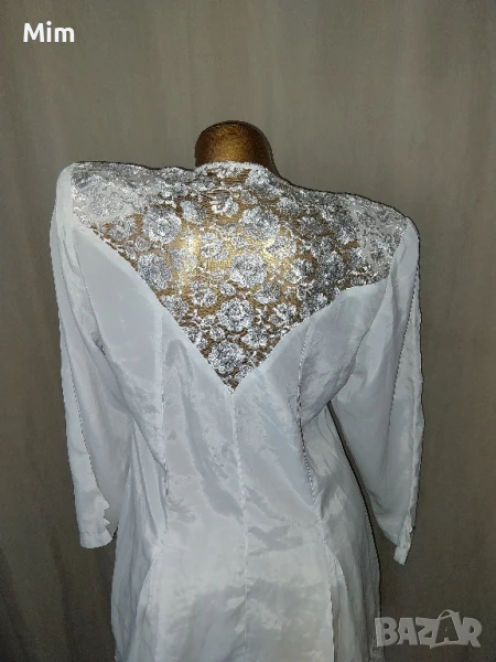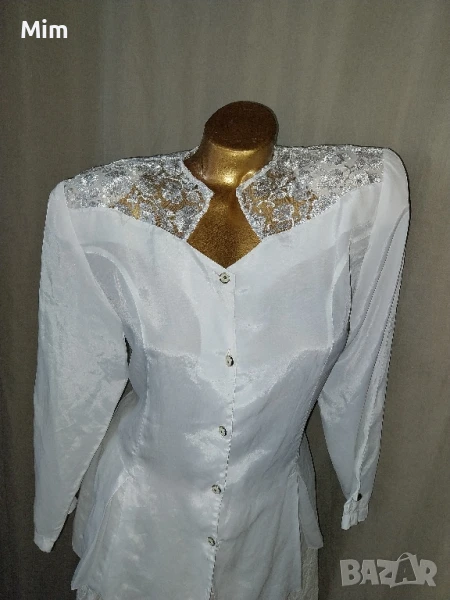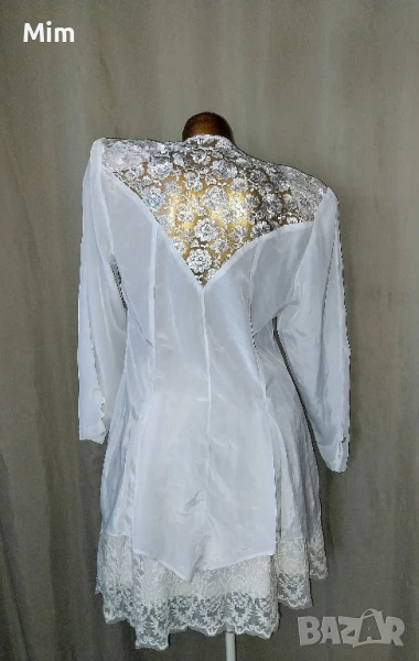Бяла риза с дълъг ръкав над бюста и отзад с дантела, закопчаването е отпред с копчета гръдна 51 см едностранно, дължината е раздвижена от 64 до 71 см ,дължина на ръкавите 53 см закопчава се с копчета и пола от дантела на фигури с подплата , в талията с ластик от 37 до 43 см дължина 44 см .