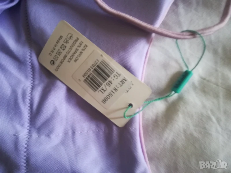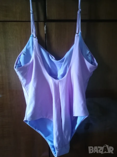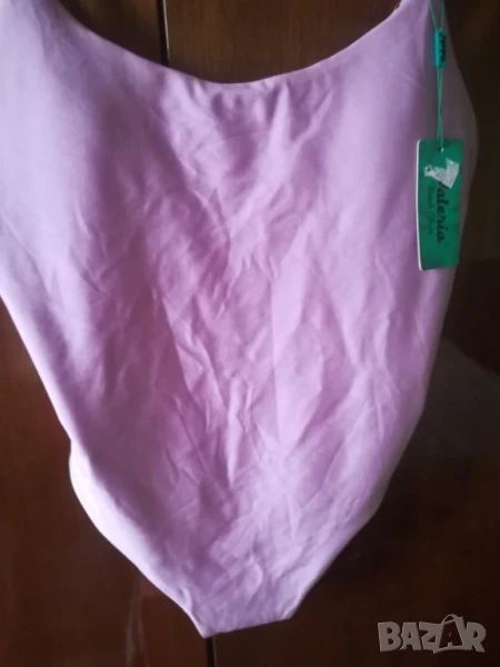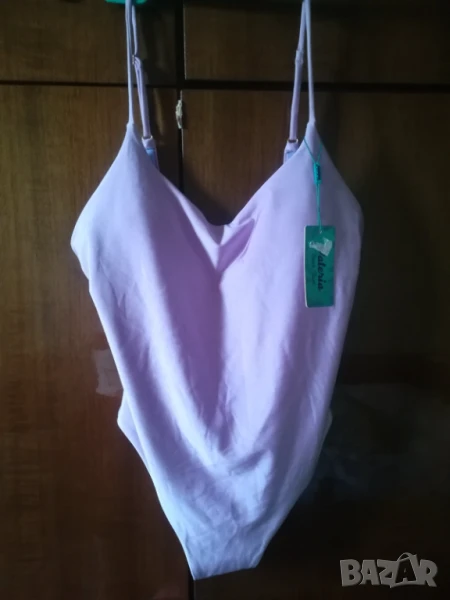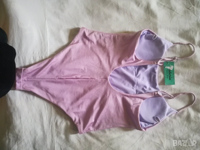 Красив цял бански в нежен люляков цвят. Ефектно деколте,с регулиращи се презрамки,на гърба не се закопчава,не прозира-подплатен е,Бързосъхнеща качествена материя,която подчертава тялото,но и прибира Има подплънки които могат да се извадят при необходимост.Размер 46-ХЛ.Чисто нов,етикет.Прекрасен бански костюм ,но за съжаление ми е малък