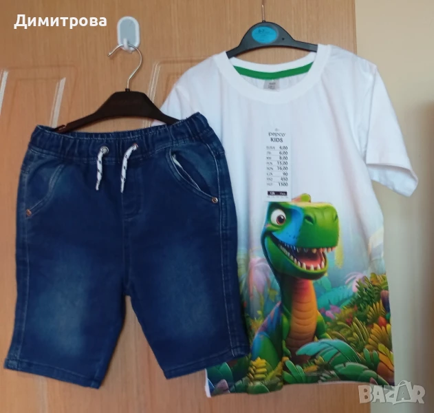 Здравейте продавам лот от чисто нова тениска и къси дънки, дънките са ползвани не повече от 2ва,три пъти размер 128см, цена за двете 5€ общо, изпращам до Спиди или Еконт с тест и преглед
