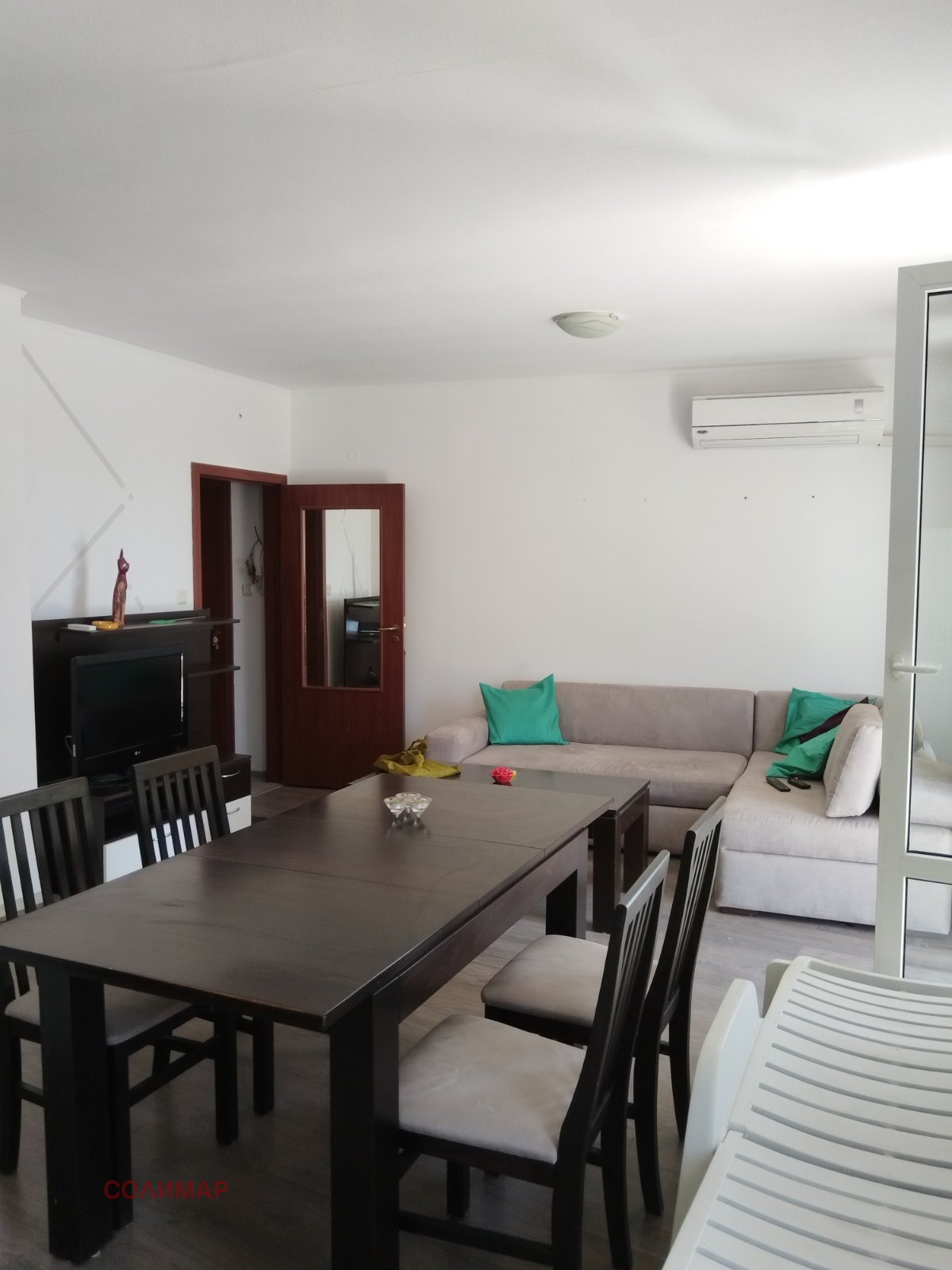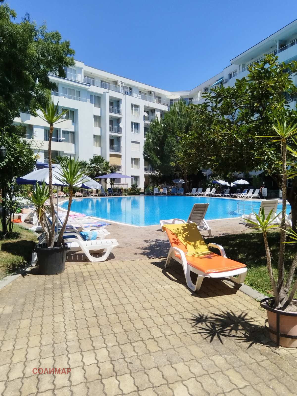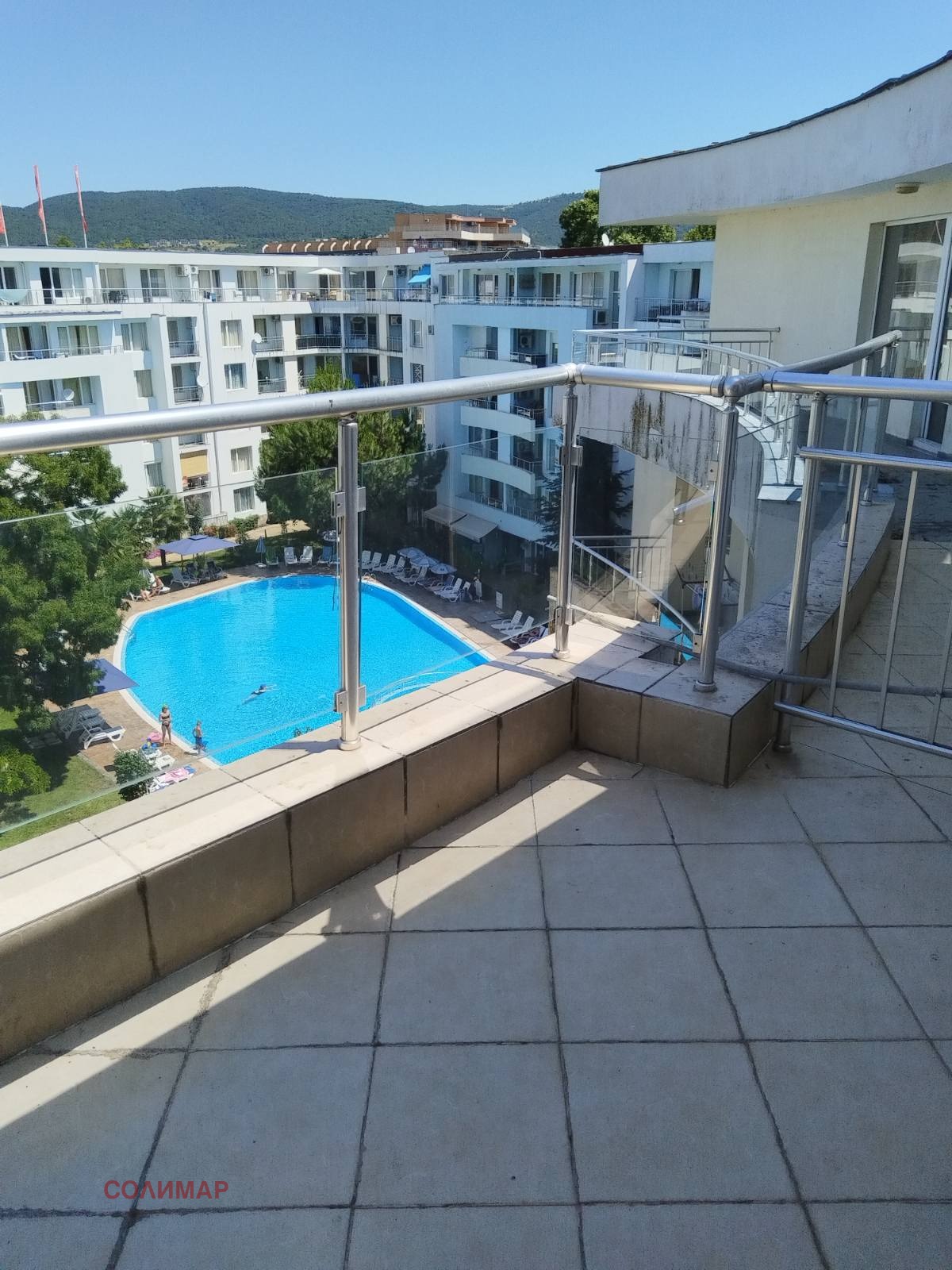 Просторен запазен двустаен апартамент с голяма тераса в комплекс 'Ясен' в сърцето на Сл.бряг.Втора линия!само 70 метра от плажа, на тиха улица, в непосредствена близост до всички удобства. Апартаментът е на 5 (последен) етаж с асансьор. Изложение: дневна- изток, спалня - север. Апартаментът е с голяма квадратура 101 кв.м. с 2 тераси, едната е 30кв.м. Обзаведена дневна с кухненски бокс, спалнята е без обзавеждане. 1 баня с душ кабина, 2 климатика.Напълно обзаведен кухненски бокс с всички уреди. Балкон в спалнята гледа към басейна. Голямата тераса - с изглед към зелените площи. Такса в комплекса е 10евро на кв.м. Има паркинг за собственици. Затворен комплекс с много зелени площи, голям басейн с детско отделеное и спокойни кътчета за релакс и почивка. Акт 16, битов ток.Възможност за целогодишно живеене.