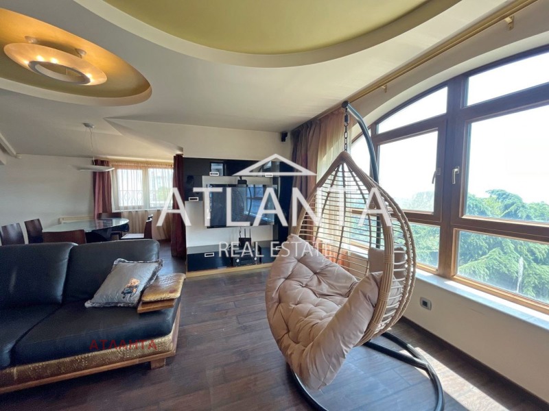 входно антре с вградени гардероби, просторна дневна с големи прозорци, обособена в кухня, трапезария и кът за мека мебел, родителска спалня със собствена баня с тоалетна, две спални, баня с тоалетна, две тераси с прекрасна панорама към морето и Морската градина.