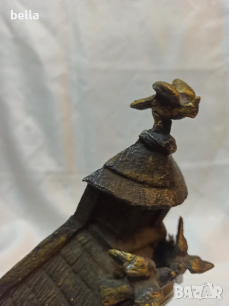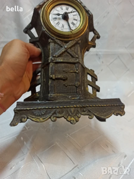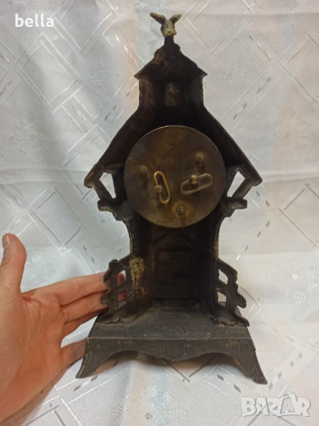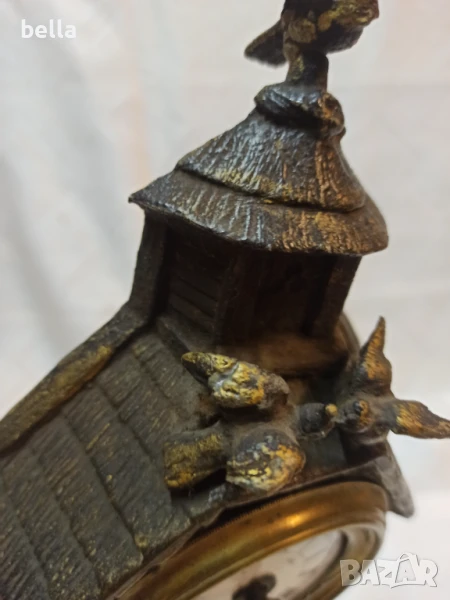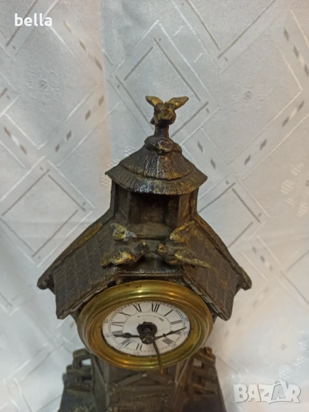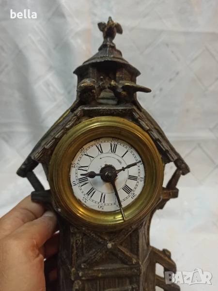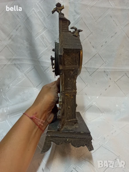 Стар антикварен каминен часовник ,порцеланов циферблат ,нужна му е профилактика ,сверяването става отпред със минутната голяма стрелка ,тези часовници датират от 1879 год,състояние видно ,материял цам ,орнаменти ,фигури липсва отпред малка част от стойката.Цена 400 лв