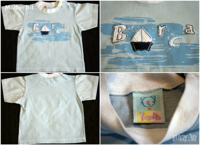 1. Цена 3,50 евро.. Нова тениска. Не е носена, само изпрана. 100% памук. Размер 12/18 м. Бледо синя, ръкавите - бяло и синьо райе. Дължина: 32,5 см.; мишници: 29,5 см.