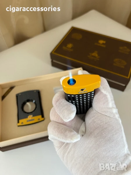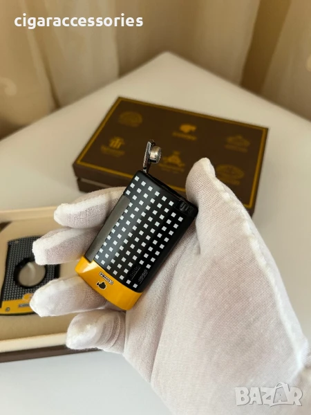 Газова турбо запалка с мощен син пламък – идеална за пури, с елегантен дизайн в черно и жълто и емблематичното