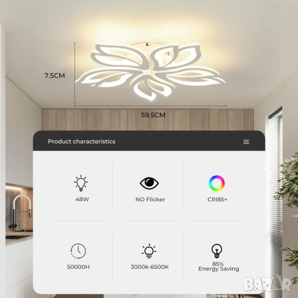 Изработен от висококачествен акрилен абажур, който има висока и равномерна пропускливост на светлината, мек и без отблясъци; удебелено шаси, не ръждясва и не се деформира.