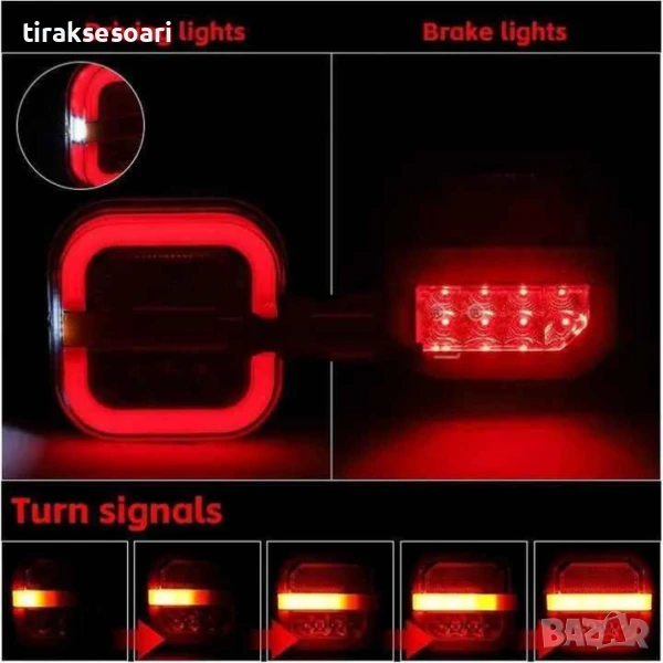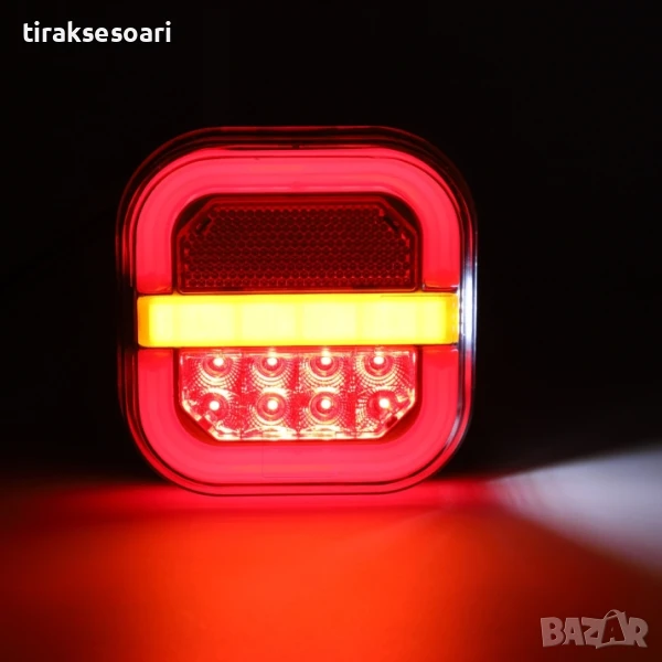 Комплект от 2 броя LED стопове T484 с неонова светлина и динамичен мигач, подходящи за камиони, ремаркета, полуремаркета, офроуд превозни средства, ATV, SUV, UTE, пикапи, трактори, автобуси, автомобили, лодки и кемпери. Стоповете имат 3 светлини с динамичен мигач за по-голяма видимост и безопасност на пътя. Работят с 12V и 24V, с дълъг живот над 50 000 часа и водоустойчивост IP66, а компактният размер 95х95х35мм позволява лесен монтаж върху различни превозни средства.