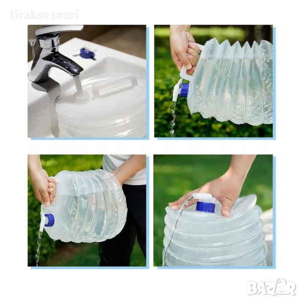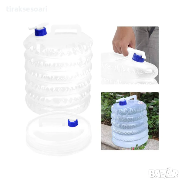 Сгъваема туба за вода с капацитет 5 литра, изработена от здрав и гъвкав PVC/PE материал без BPA, удобна за къмпинг, пътуване и туризъм, компактна при сгъване, с херметически капак против разливи и удобна ръкохватка за лесно носене.