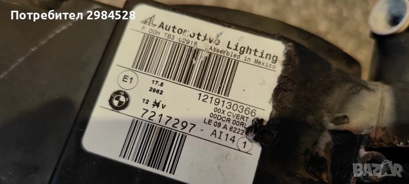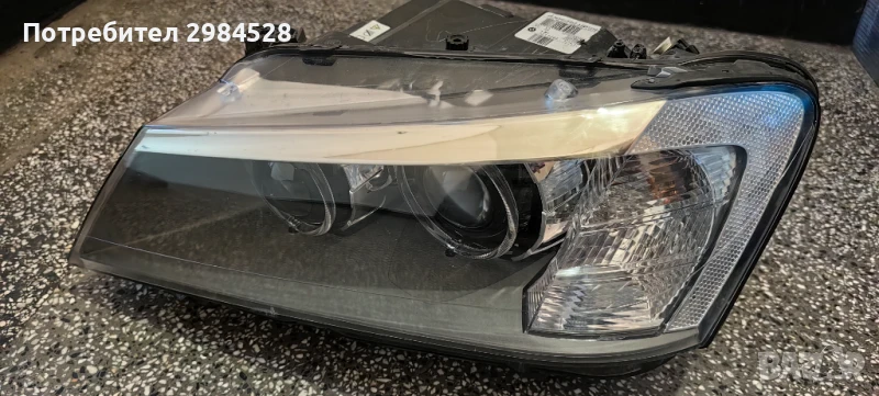 Оригинален ляв фар за BMW X3 F25 - Dynamic Xenon, стъкло и корпус в много добро състояние. Горния захват от към предната решетка е счупен, а другия е залепен. Двата долни захвата са добре.Необорудван, и без задното капаче.