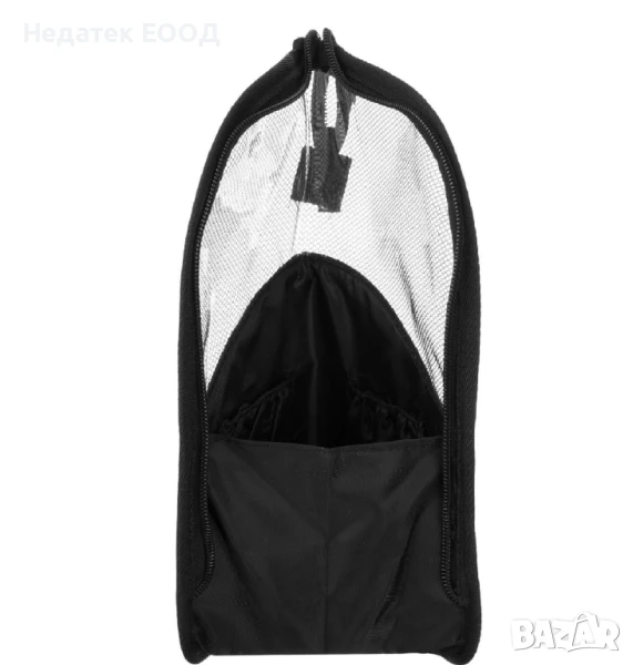 Прозрачна козметична чантичка с черна мрежа и черен плат с принт "Travel Season". Разполага с 2 вътрешни отделения с малки прегради за съхранение на четки, моливи за грим и др.