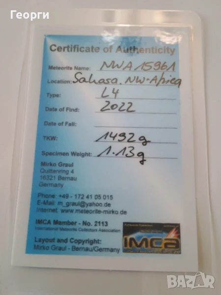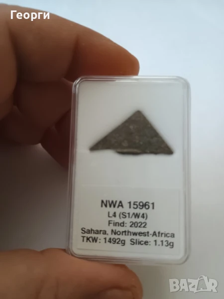 Много красив натурален метеорит,името му е NWA 15961 намерен е в Африка през 2022 година.Другото го пише на кутийката и на сертификата.