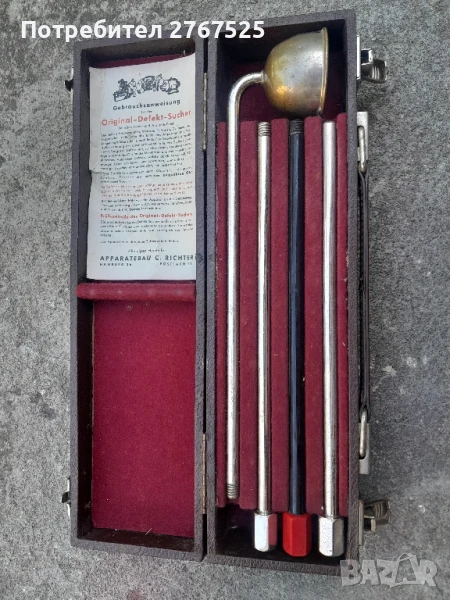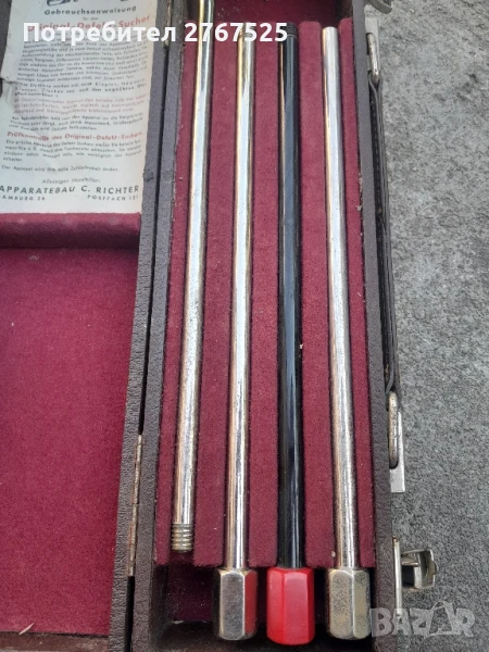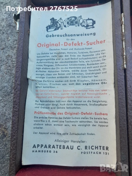 За да откриете дефекти в машини, двигатели, турбини, динама и др., поставете края на устройството (удължителите се завинтват според нуждите) към външната стена на частите, които ще се слушат, като цилиндри, скоростни кутии, карбуратори, диференциали, корпуси на клапани, капаци на колела и др. След това докоснете ухото си до диафрагмата и по този начин, просто чрез слушане, надеждно открийте дефекти, причинени от износване, липса на масло, разхлабване на болтове и винтове, течове и други причини.Тези дефекти се забелязват веднага, дори за необученото ухо, чрез чукане, чукване, драскане, съскане и др.Ако има риск от токов удар, използвайте червения изолиращ звукопроводник, който едновременно заглушава фоновия шум и кристализира шума.За дефекти в тръбите, дръжте устройството до щранг, хидрант или подобно. Дефектите могат да бъдат открити и през зидария, настилка и почва.Тестване на оригиналния детектор за дефектиВече ще определите точната функция на детектора за дефекти, ако го използвате, за да слушате например джобен часовник. След това ще бъдете изумени колко отлично работи устройството.Устройството ще ви задоволи напълно.Състояние много добро и запазено видно от снимките.