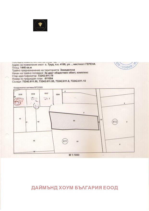 🏡 Агенция за недвижими имоти Diamond Home предлага за продажба парцел в регулация в с. Труд с отлична локация и голям потенциал! Парцелът е с площ от 1447 кв.м., подходяща както за жилищно строителство, така и за промишлени или обществени дейности.