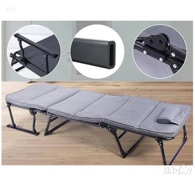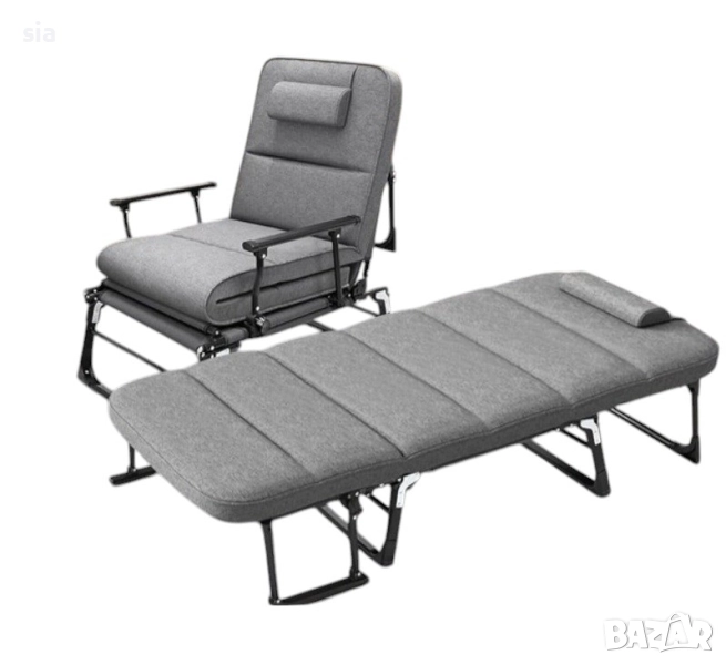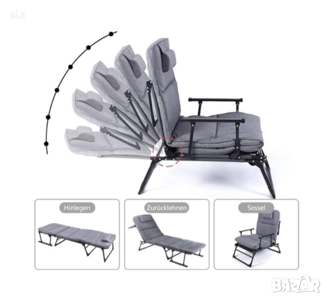 Преносим сгъваемо легло или шезлонг за къмпингари с 6 позиции. Само с няколко стъпки можете да трансформирате шезлонга в удобна пейка, на която можете да лежите или да го ползвате като място за сядане. Разполага с Дишаща подплата, която осигурява уют и удобство. Възглавниците се свалят. Рамката е изработена от 22 мм квадратни тръби, с максимална товароносимост от 180 кг. за изключителна издръжливост.