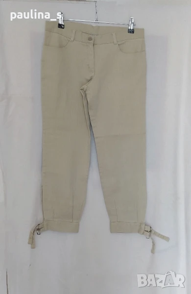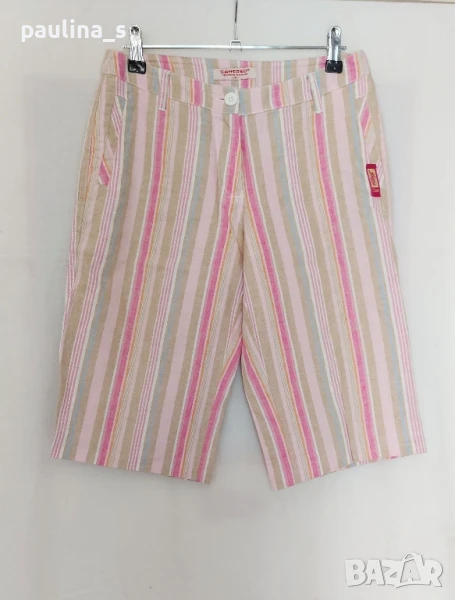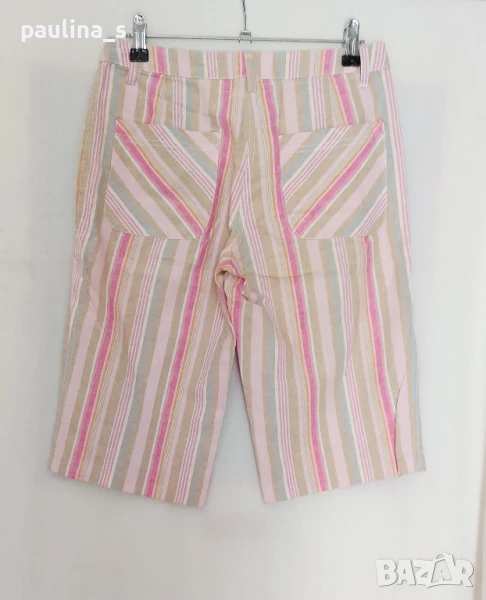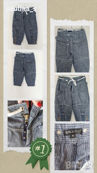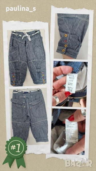 1️⃣. Колаж / XS / S - "Monica Ricci". Цената е крайна 54,99лв / 27,5 евро. Дамски(Юношески) бермуди от раиран плат със съдържание на лен. Моделът и брандът са много специални, потури и шалвари. Джобовете отпред са косо разположени с накъсан ефект по краищата, ципът е масивен, отгоре са с оригинален колан, който се провира през метални халки. Колената са фиксирани и богато декорирани с цветни копчета и украсителни сигнални тегели. Отзад са също с капаци и множество светли сигнални тегели.