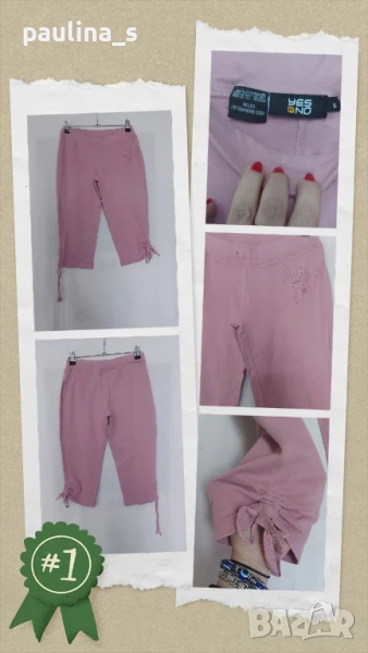 6️⃣. Колаж / XS / M - "Yes or No". Цената е крайна 19,99лв / 10 евро. Дамски / Юношески еластични памучни бермуди с набиращи се крачоли и бродерии. Цветът е млечно розово, материята е 100% органичен памук, трико, покрива няколко размера. Може да се използват и за спортуване или плажуване. Като нови.