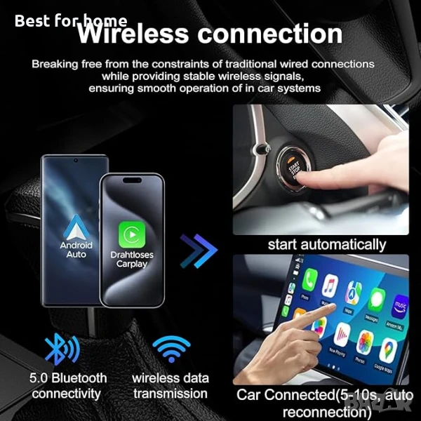 Безжична свързаност: благодарение на използването на двойна безжична Bluetooth и Wi-Fi връзка, е напълно освободено от традиционната кабелна връзка. CarPlay или Android Auto, Carplay адаптерът може да осигури стабилни безжични сигнали, за да гарантира безпроблемната работа на системата в автомобила. Безжичната връзка не само опростява прокарването на кабелите в автомобила, но също така подобрява комфорта и лекотата на използване.