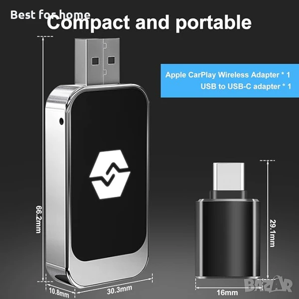Безжичен адаптер CarPlay: ще получите безжичен адаптер Carplay (68 x 30 x 11 мм) и USB към USB-C адаптер (29 x 16 мм). Малък и лек, лесен за носене и удобен за поддържане на реда на таблото. Ако интерфейсът на колата ви е USB или USB-C, можете да използвате нашия безжичен адаптер CarPlay.