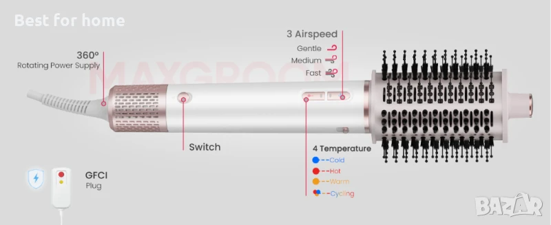 РЕГУЛИРУЕМИ НАСТРОЙКИ ЗА ТЕМПЕРАТУРА И СКОРОСТ: Четката за сешоар с въздушен поток MAXGROOM предлага 4 настройки за температура (студена, топла, гореща, редуване на гореща/студена) и 3 скорости на вентилатора, осигурявайки пълен контрол върху стилизирането. За разлика от традиционните четки за горещ въздух, този усъвършенстван инструмент може да се използва върху мокра коса, спестявайки ви време, като комбинира сушене и стилизиране в една стъпка. Идеален за всички типове коса, той осигурява персонализирано и безопасно стилизиране за всеки потребител.