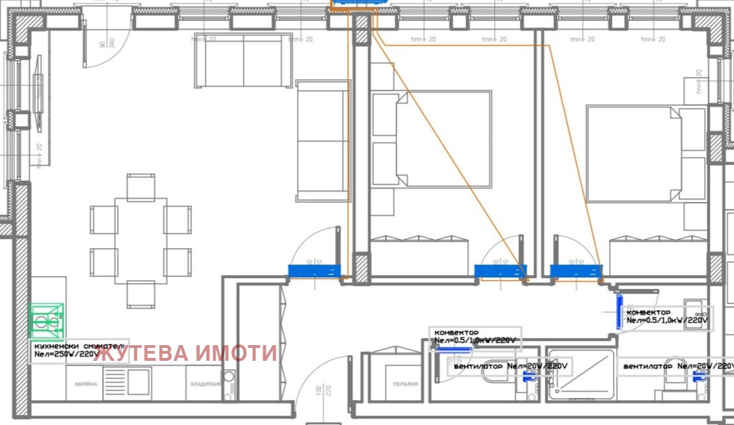 Състои се от просторен хол-всекидневна, две самостоятелни спални, два санитарни възела, мокро помещение и тераса.