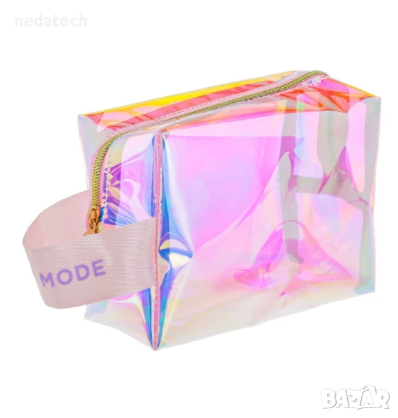 Лятна несесер за тоалетни принадлежности, прозрачно розово холографско, със златен цип, с розова дръжка и лилав принт „Vacay mode“.
