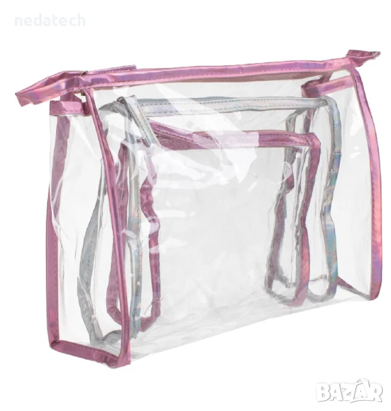 Комплект летни козметични чантички с голяма прозрачна PVC чанта 26,5x9x20см с розов метален кант и розов цип с примка по ръба, прозрачна чанта със сребрист метален кант и сив цип 20,5x7x16см и прозрачна чанта 16,5x5,5x15см с розов метален кант и розов цип.