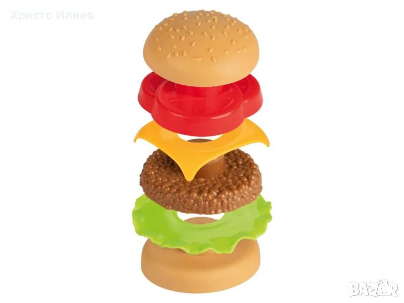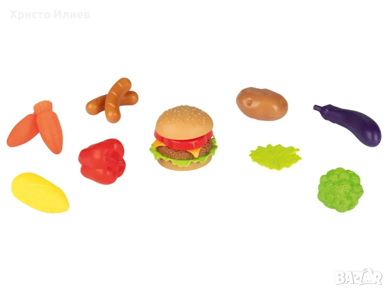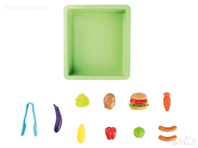 1x грил, 1x бургер, 2x наденички, 1x царевица, 1x патладжан, 1x картоф, 2x моркова, 1x чушка, 1x броколи, 1x лист маруля, 1x щипки за грил и 1x зелена купа в грила