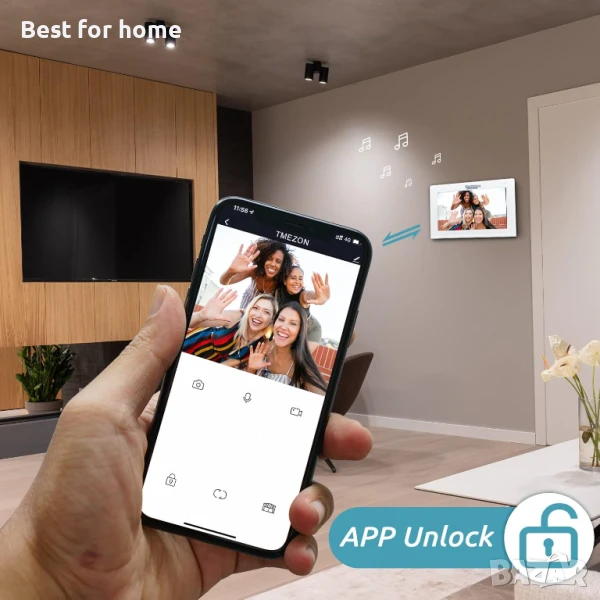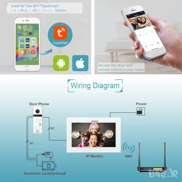 TMEZON 4-жична видеодомофонна система с тъчскрийн монитор: С най-новата IP технология, когато посетителите натиснат звънеца на вратата, телефонът ви ще получи известие от приложението. Можете да виждате, чувате и говорите с някого на вратата ви, дори дистанционно да отключвате чрез вашия смартфон отвсякъде. Можете да отваряте вратата с ръка. Може да се използва в апартаменти, вили, хотели, офиси, обществени сгради. Приложението е "TuyaSmart".