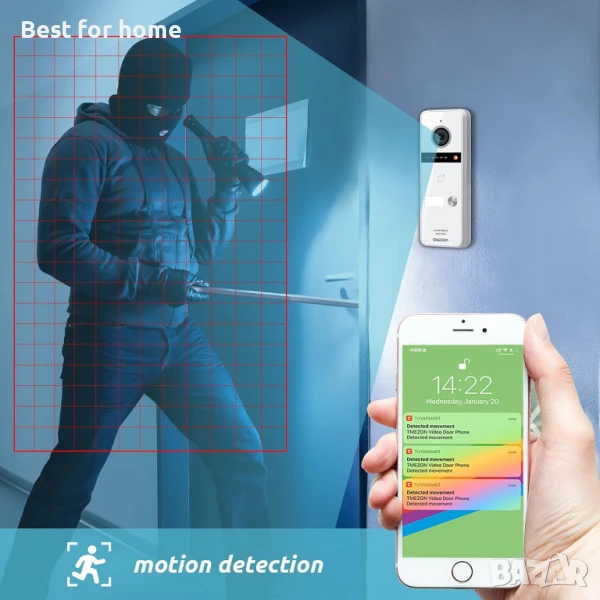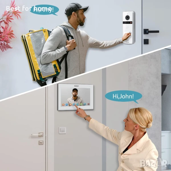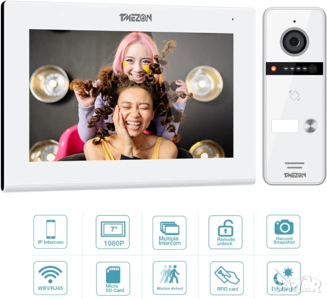 7-инчов LCD монитор и мини звънец: 7-инчов TFT дисплей с елегантен дизайн, работа с тъчскрийн, безконтактно управление, поддръжка на WiFi връзка с интернет. Външен звънец с водоустойчив капак, вграден инфрачервен сензор и 1080P камера, 125º широкоъгълен обхват, нощно виждане, водоустойчив, прахоустойчив и антивандализъм. Може да се свърже с всички 12 V електронни брави.