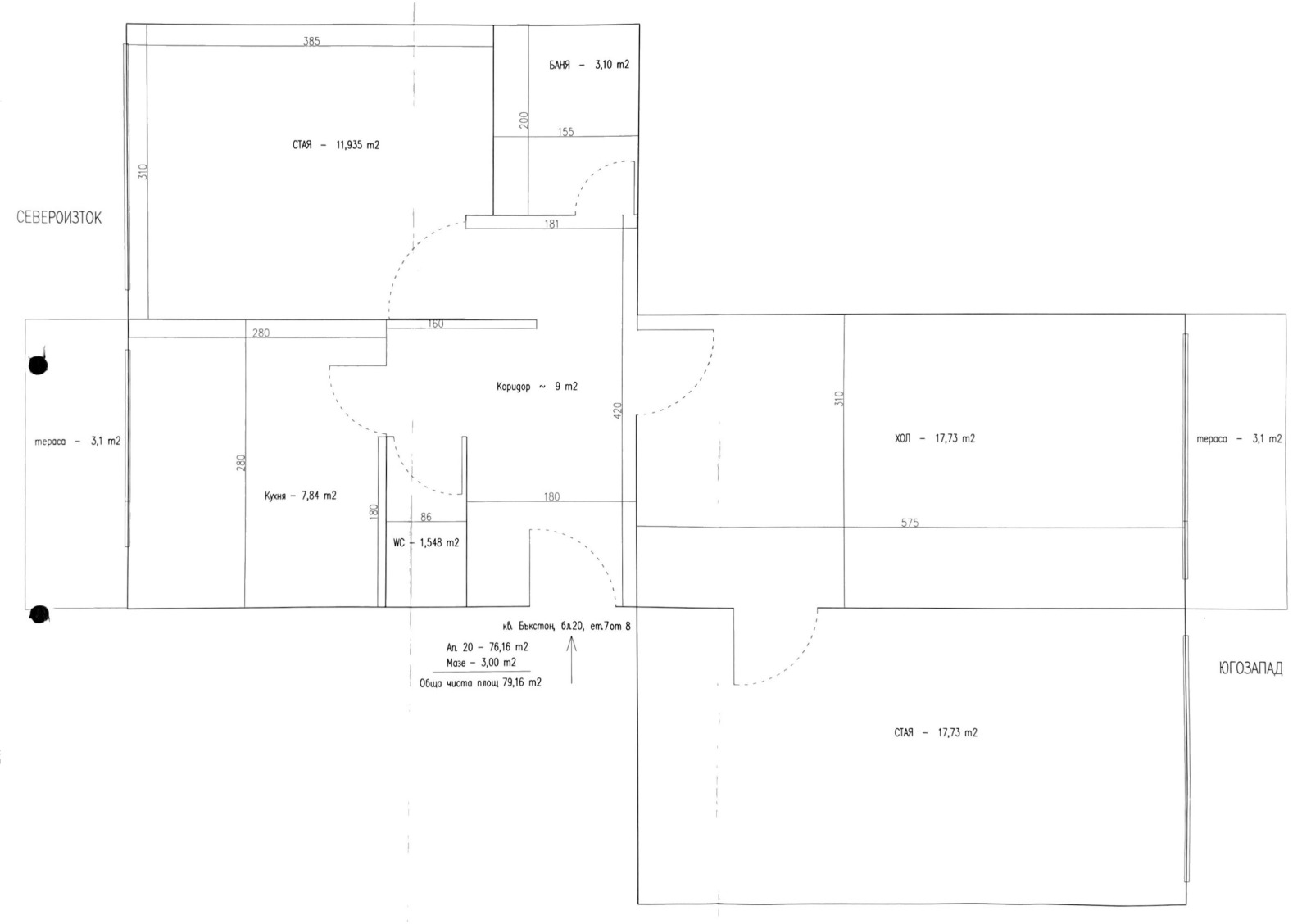 Разпределение: голям хол с тераса, кухн с тераса, две спални, баня, отделна тоалетна и коридор.